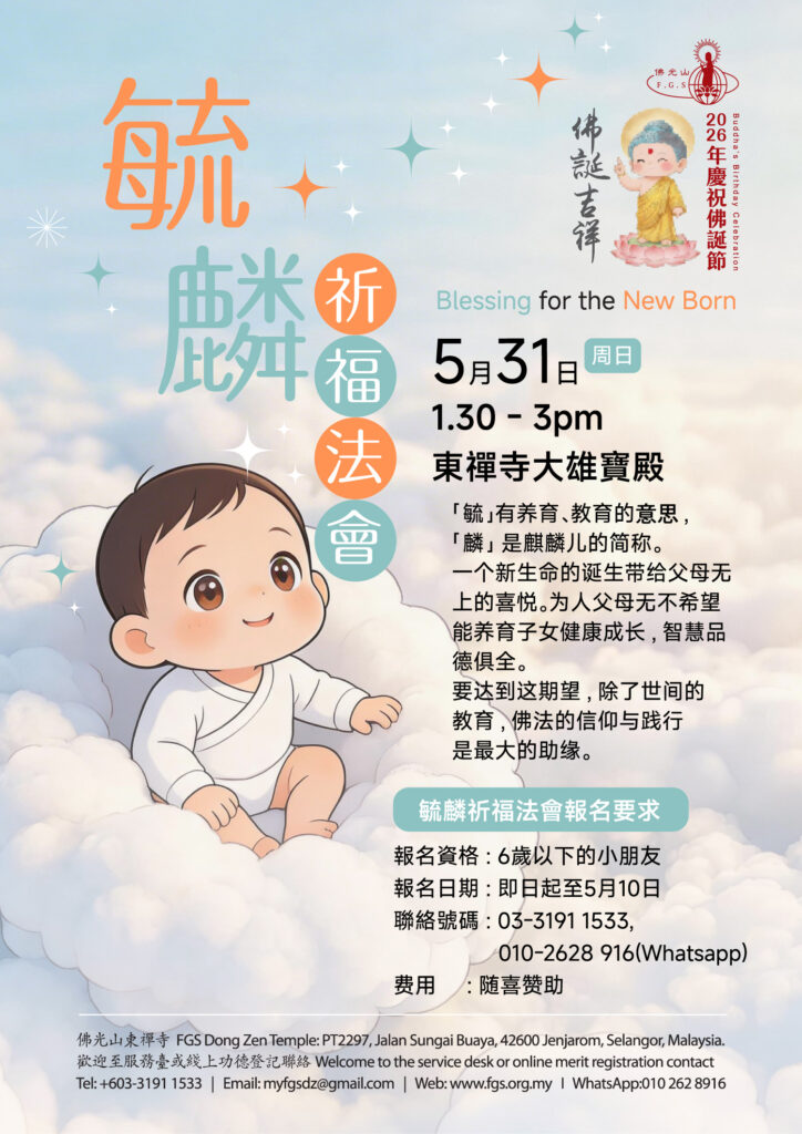 馬來西亞佛光山東禪寺特於衛賽節浴佛法會之期舉辦毓麟祈福,讓麒麟兒自小有機會親近三寶,以佛法僧作為人生導師,也祈願孩子在佛菩薩的庇佑下健康成長。這是父母予孩子的最好的禮物與祝福。有意參加者請盡早報名。