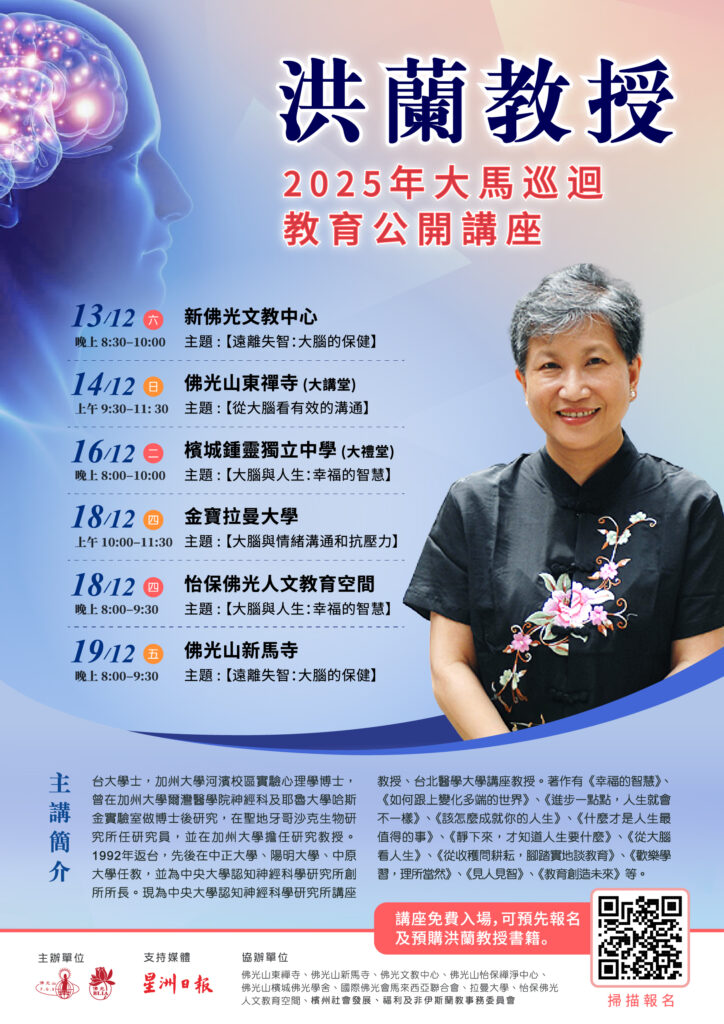 講座免費入場,可預先報名及預購洪蘭教授書籍。