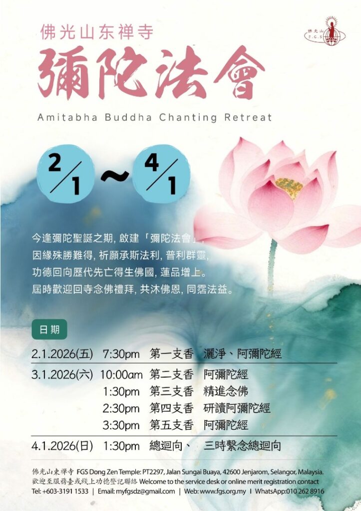 今逢彌陀聖誕之期,本寺謹訂於西元2026年1月2日至1月4日(農曆十一月十四至十六日) 啟建精進念佛「彌陀法會」三永日,因緣殊勝難得,祈願承斯法利,普利群靈,功德回向護法信徒諸事如意,陽上眷屬消災增褔慧,歷代先亡得生佛國,蓮品增上。屆時歡迎回寺念佛禮拜,共沐佛恩,同霑法益。阿彌陀佛!