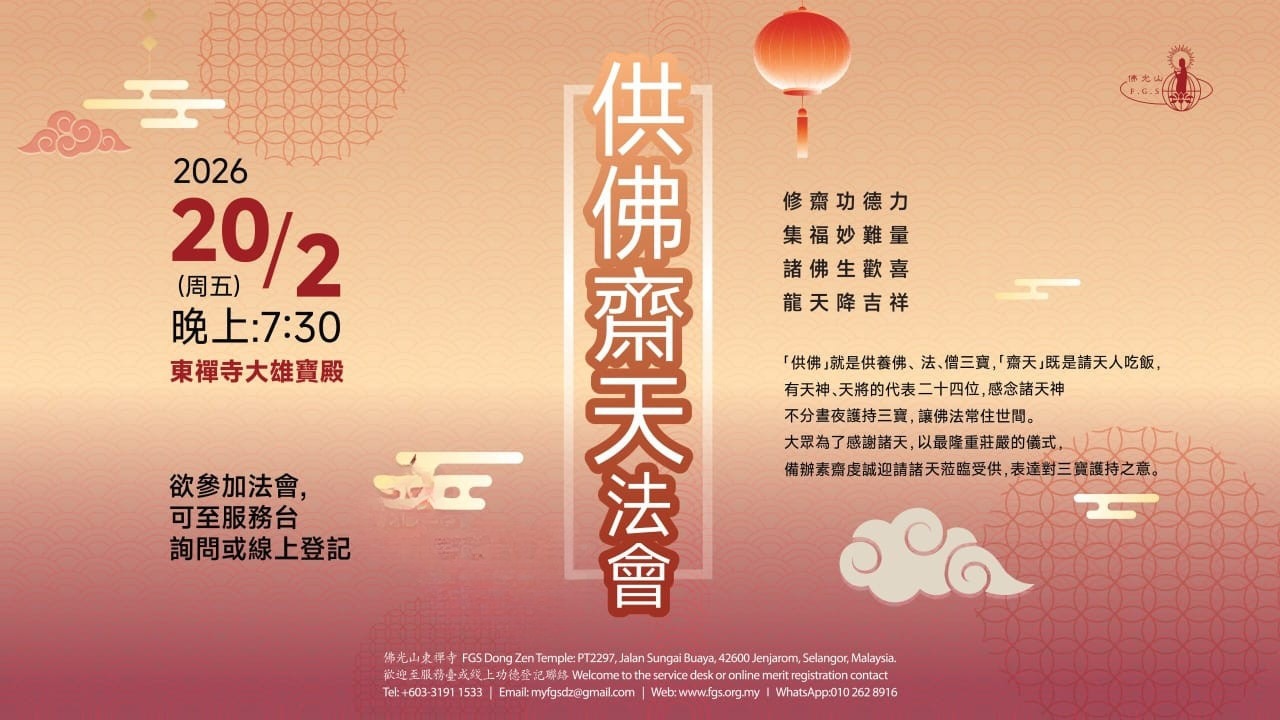 佛光山東禪寺2026年平安燈會暨花藝展 首页 2026年佛光山東禪寺【新春上燈法會】 活動詳情 2026年佛光山東禪寺【新春平安燈】 活動詳情 2026年佛光山東禪寺【全年光明燈】 活動詳情 2026年佛光山東禪寺【新春禮千佛法會】 活動詳情 佛光山東禪寺2026春節【供佛齋天】 活動詳情 佛光山東禪寺2026年新春法會時間 活動詳情 < 1 >