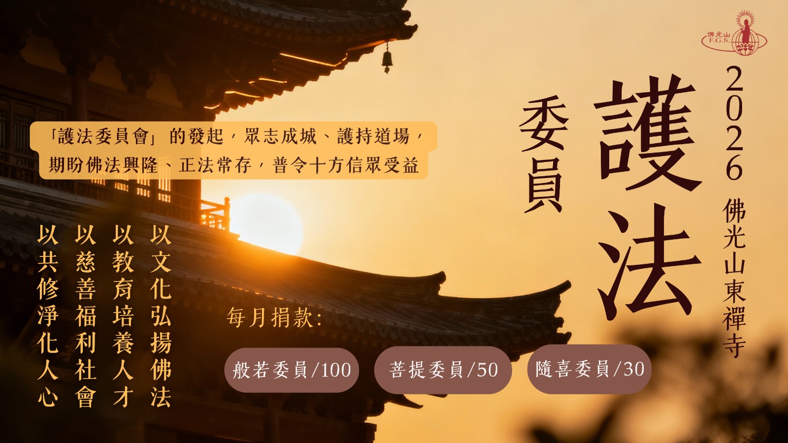 Previous Next 公告周知 馬來西亞佛光山今日嚴正聲明,從不曾在馬來西亞或其他地區,授權任何拍賣行、機構或個人販賣或拍賣星雲大師的墨寶,任何拍賣行為均與佛光山無關。馬來西亞佛光山 敬啟 活動訊息 近期活動 法會修持 線上捐款 社教課程 2026年佛光山東禪寺【歲末祭祖法會】 2026年佛光山東禪寺【全年光明燈】 2026年大悲懺法會 2026年佛光山東禪寺【歲末祭祖法會】 2026年佛光山東禪寺【新春上燈法會】 2026年佛光山東禪寺【新春平安燈】 2026年佛光山東禪寺【全年光明燈】 2026年佛光山東禪寺【新春禮千佛法會】 佛光山東禪寺2026春節【供佛齋天】 佛光山東禪寺2026年新春法會時間 「墨石神韻 似與不似之間」- 張正林水墨篆刻書法展 「美麗世界」- 陳學浯畫展 2026年大悲懺法會 2026 佛光山東禪佛教學院 [招生] 2026 東禪青年書院【招生中】 2025年蕉賴佛光分會【佛法真義】系列講座 2025年馬六甲佛光分會【佛法真義】系列講座 佛光山東禪寺【護法委員】 【青年義工】你做了吗? 馬來西亞佛光山線上捐款系統 點擊進入 佛光山東禪寺【護法委員】 點擊進入 功德登記 點擊進入 2025【經典選要】系列講座 東禪二十四堂令鼓【招生】 2025佛光兒童合唱團【招生】 影音清流 佛佑FOR YOU 在《佛佑FOR YOU》這個平臺,有法師、主持人和來自不同領域的嘉賓,各自分享的心靈收穫,讓我們有機會從中學習,同時遇見安住身心的方法。 當您需要陪伴的時候,這裏有法音清流,Just For YOU ! 瞭解更多 誠心誠意 每逢星期六,佛光山新馬泰印總住持覺誠法師YouTube開講,以佛法相互交流,以三好淨化心靈。 點擊觀賞 認識馬來西亞佛光山 道場介紹VR全景導覽 我們的宗旨 以文化弘揚佛法 以文化弘揚佛法 人間福報、人間衛視、東禪佛教學院月刊。透過編印藏經,出版各類圖書。肩負起為大眾傳播法音的責任。 以教育培養人才 以教育培養人才 實踐大師提倡「人間佛教」的理念,創辦佛光山東禪佛教學院。定期為社會各階層人士舉辦之種種活動。藉此讓佛法普及社會並提升佛教徒的生活品質。 以慈善福利社會 以慈善福利社會 佛光山本著佛陀「無緣大慈,同體大悲」慈悲濟世的本懷。提供各項免費服務,包括佛光診所、急難救助 以共修淨化人心 以共修淨化人心 定期舉辦各種法會,如上燈法會、大悲懺法會、梁皇寶懺、地藏法會、精進念佛會等;並走出寺院,進入社會各階層,舉辨浴佛法會、法寶節分送臘八粥,以佛陀的祝福安定人心 在委屈中學習經驗,在困難中接受挑戰,在失敗中累積智慧,在挫折中鍛煉意志。《 366天与大师相会 》— 星雲大師