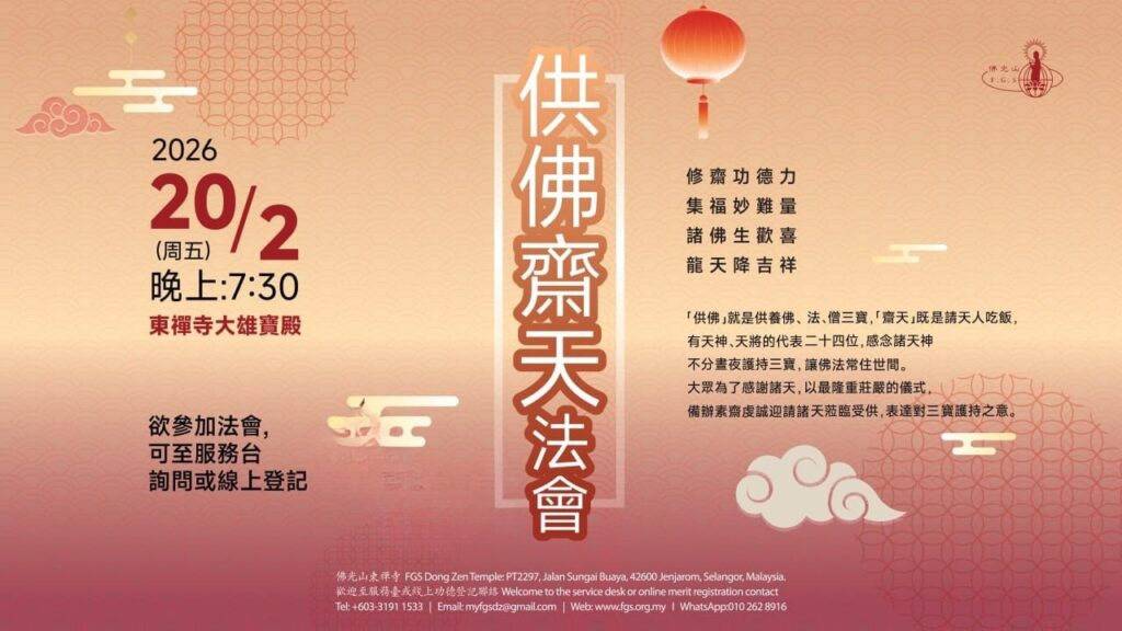 2026年佛光山東禪寺【新春上燈法會】 《華嚴經》說「千年暗室一燈即明」,燈是一種光明更是代表了智慧。新春期間,佛門裡從正月初一開始一直到元宵,都會舉行上燈法會,供信徒在新一年的初始,於佛前種下善根因緣、虔祈無不滿願。 日期 Date : 17.2.2026~2.3.2026(正月初二至十四日)時間 Time :7:30 pm地點 Venue : 佛光山東禪寺大殿前廣場 聯 絡 Contact:(03) 3191 1533Whatsapp: 010-262 8916